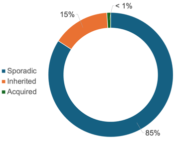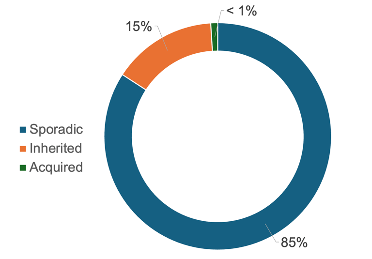 In humans, the vast majority of prion diseases occur sporadically, which means we do not understand why these individuals are susceptible. Approximately 10% of cases are inherited, and result from a mutation in the prion protein gene. Only a small fraction of these diseases arise from exposure to infectious prions, which can be transmitted through oral consumption or medical procedures.